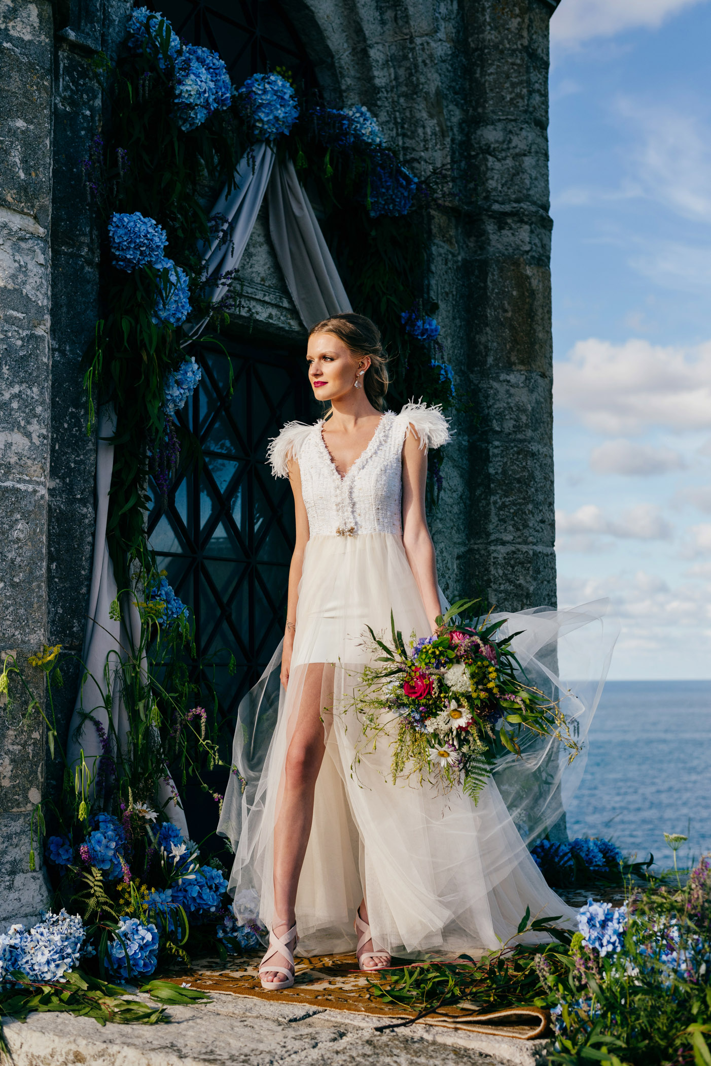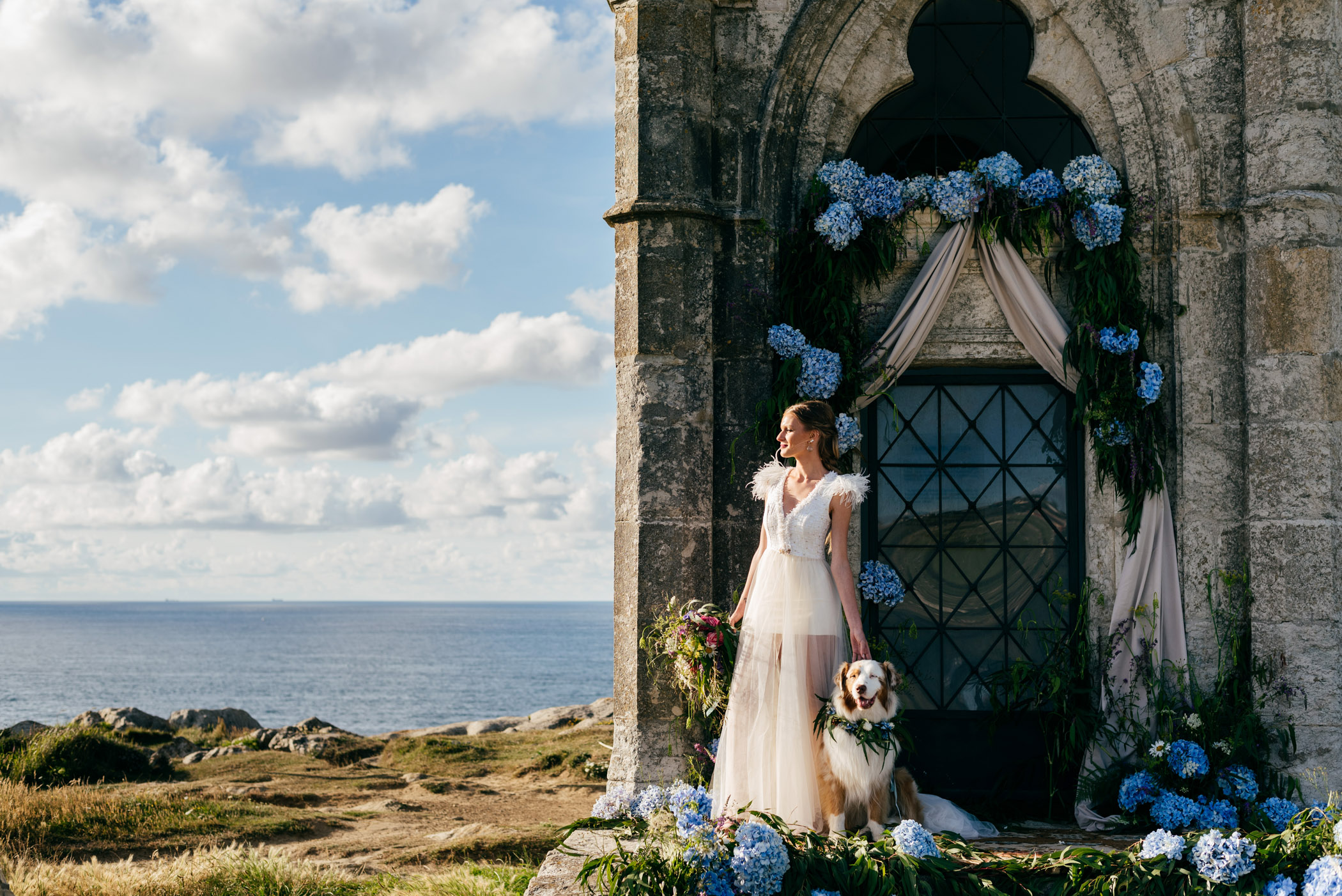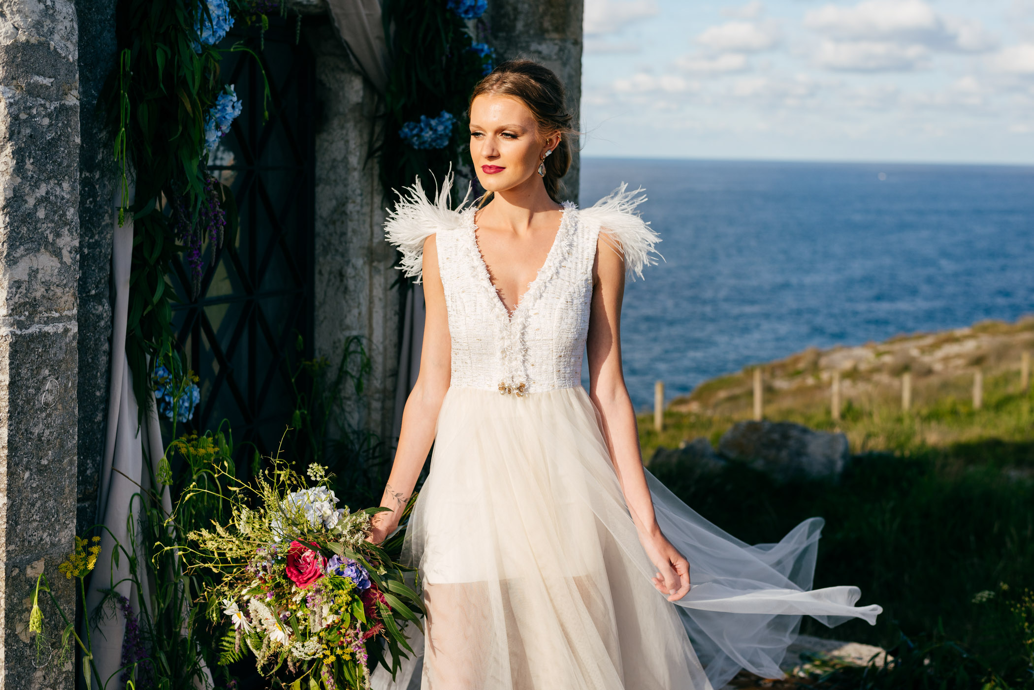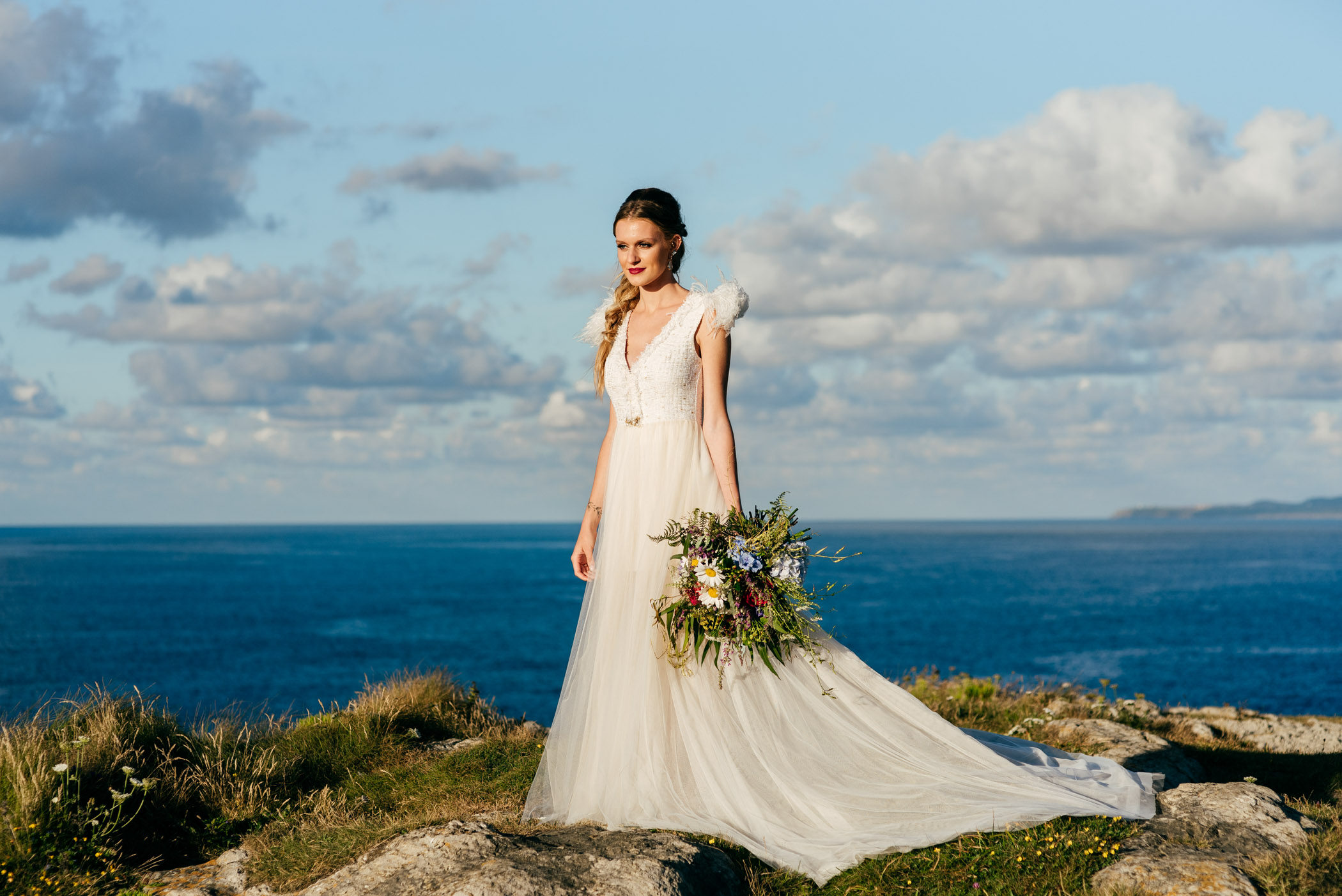La impresionante decoración floral y el ramo de novia fueron creados por Roberto de Harvest wood & flowers. Y por supuesto, el escenario elegido es sin duda el gran protagonista de la sesión, bendecido por la magia de la luz del norte, nuestro mar y nuestro cielo.